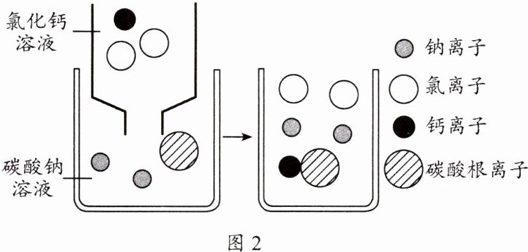 (3)反应③为复分解反应,图 2 是氯化钙溶液和碳酸钠溶液反应的微观示意图。据图可知,反应过程中,离子数目减少的有 ,恰好反应后的溶液中含有的离子有 (用符号表示)。