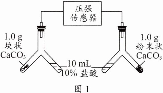 9. 化学小组利用图 1 所示装置探究碳酸钙与盐酸的反应。实验开始时,倾斜 Y 形管,使 10 mL 10%盐酸(足量)与 CaCO₃固体充分接触,试管内气压随时间的变化曲线如图 2 所示。