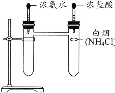 5.如下图所示,分别同时在双连试管中滴入2~3滴浓氨水和浓盐酸,2~3s后即观察到滴入浓盐酸的试管中产生白烟。下列叙述错误的是( )。