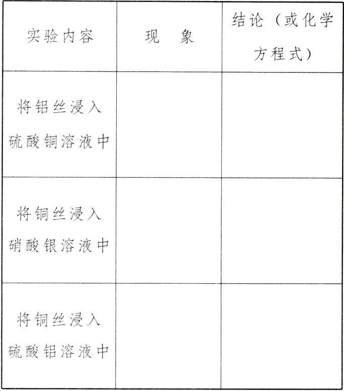 (3)铝丝表面覆盖一层红色的物质,溶液由蓝色逐渐变为无色 2Al + 3CuSO₄ = Al₂(SO₄)₃ + 3Cu;铜丝表面覆盖一层银白色物质,溶液由无色逐渐变为蓝色 Cu + 2AgNO₃ = Cu(NO₃)₂ + 2Ag;无,不反应。