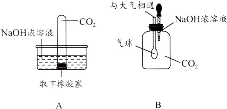 3. 某兴趣小组同学为探究CO₂和NaOH是否发生了化学反应,设计了如图所示的A、B实验,验证CO₂与NaOH溶液发生了化学反应。实验现象为:A中试管内液面上升,B中气球胀大。