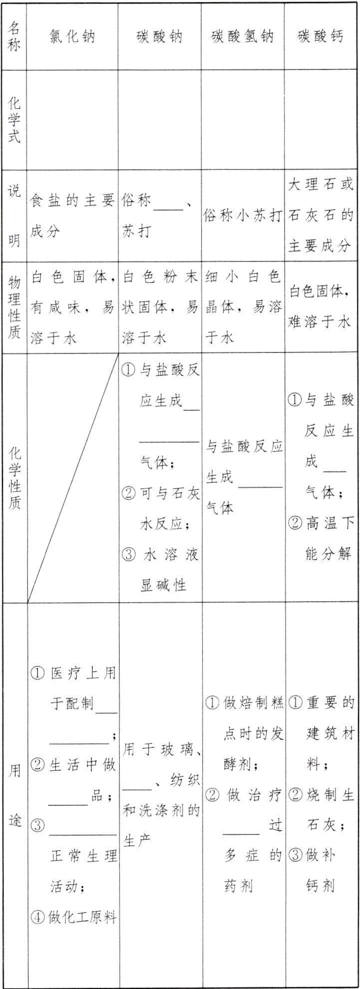 [要点梳理] 1.NaCl、Na₂CO₃、NaHCO₃、CaCO₃,纯碱是Na₂CO₃,生理盐水用NaCl,NaCl可用于调味、维持人体正常生理机能,Na₂CO₃可用于造纸,NaHCO₃可用于治疗胃酸。