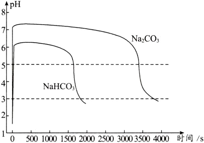 将上述实验中Na₂CO₃换成NaHCO₃,重复实验过程。所得两条曲线如下图所示。