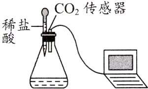3. 为测定某氢氧化钠固体是否变质,兴趣小组同学取一定量的样品配制成溶液,加入( )锥形瓶中,再逐滴加入稀盐酸至过量,并利用传感器测定CO₂的含量,如图所示。