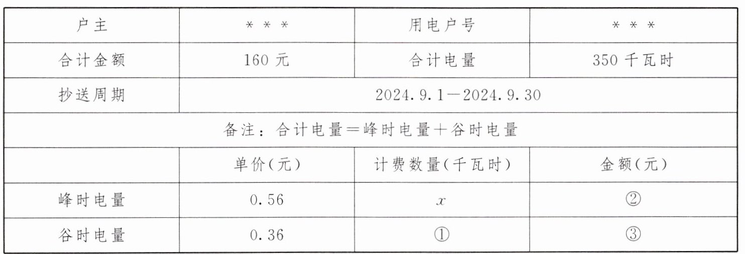 8. 为促进电力资源的优化配置,某地居民用电实施峰谷计费. 峰时段为$8:00 - 21:00$;谷时段为$21:00 - $次日$8:00$. 下表为该地某户居民2024年9月电费账单的部分信息,设其中的峰时电量为$x$千瓦时,根据所给信息,解决下列问题: