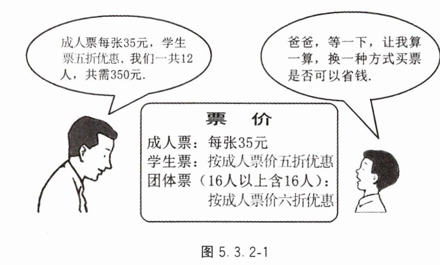 4. 五一节期间,小明、小亮等同学随家长到某公园游玩,以下是购买公园门票时小明与他爸爸的对话,试根据图 5.3.2-1 中的信息解答下列问题: