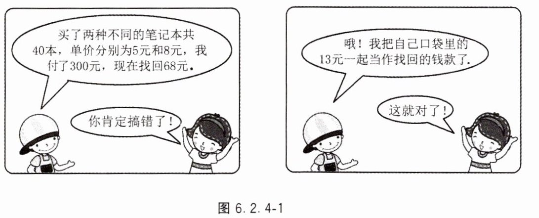 4. 某班将举行“知识竞赛”活动,班长安排小明购买奖品,图 6.2.4 - 1 所示的是小明买回奖品时与班长的对话情境. 请根据对话的信息计算:单价 5 元的笔记本买了多少本?