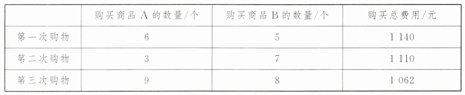 6. 小林在某商店购买商品 A、B 共三次,其中只有第三次购物时商品 A、B 同时打折,其余两次均按标价购买,三次购买商品 A、B 的数量和费用如下表所示: