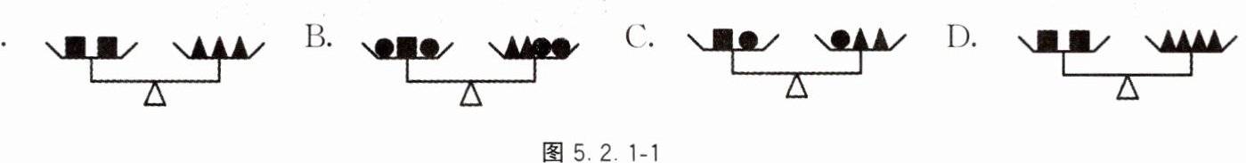 2. 有三种不同质量的物体“■”“▲”“●”,其中,同一种物体的质量都相等. 现将天平的左、右托盘中都放上不同个数的物体,如图5.2.1 - 1所示的四个天平中只有一个天平状态不对,则该天平是( ).