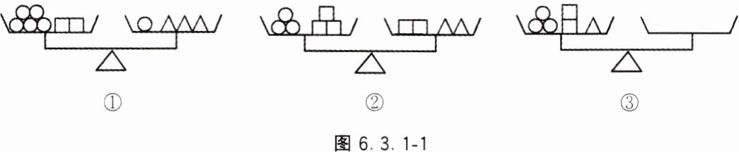 2. 如图6.3.1-1,三个天平的托盘中,形状相同的物体质量相等. 图①、②所示的两个天平处于平衡状态,若要使图③的天平也保持平衡,则需在它的右盘中放置( ).