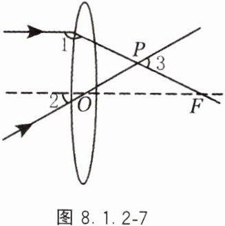 8. 如图 8.1.2-7,一束平行于主光轴的光线经凸透镜折射后,其折射光线与一束经过光心$O$的光线相交于点$P$,点$F$为焦点. 若$\angle1 = 155^{\circ}$,$\angle2 = 30^{\circ}$,则$\angle3$的度数为( ).