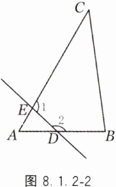 2. 如图 8.1.2-2,在$\triangle ABC$中,$\angle A = 60^{\circ}$,点$D$、$E$分别在$AB$、$AC$上,则$\angle1 + \angle2$的度数为( ).