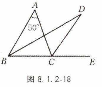 10. 如图 8.1.2-18,在$\triangle ABC$中,$\angle A = 50^{\circ}$,$\angle ABC$的平分线与外角$\angle ACE$的平分线交于点$D$,求$\angle D$的大小.
