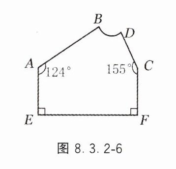 6. 如图 8.3.2 - 6,一块较为精密的模板中,$AB$、$CD$的延长线应该相交成$80^{\circ}$的角,因交点不在模板上,不便测量,现测得$\angle BAE = 124^{\circ}$,$\angle DCF = 155^{\circ}$,$AE\perp EF$,$CF\perp EF$,此时$AB$、$CD$的延长线相交所成的角是否符合规定?为什么?