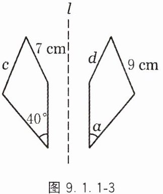 4. 如图9.1.1 - 3,两个四边形关于直线l对称,则c = ______cm,d = ______cm,∠α的大小为______.