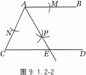2. 如图9.1.2-2,AB//CD,以点A为圆心,适当长为半径作弧,分别交AB、AC于点M、N,再分别以点M、N为圆心,大于$\frac{1}{2}MN$长为半径作弧,两弧相交于点P,作射线AP,交CD于点E. 若∠C = 70°,则∠AEC的大小为( ).