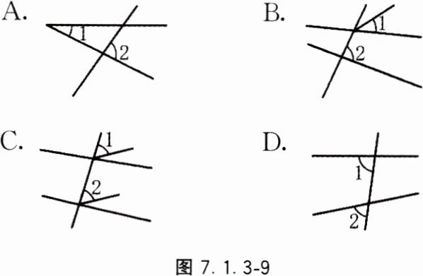 9. 在图7.1.3-9中,∠1和∠2不属于同位角的一组是( ).