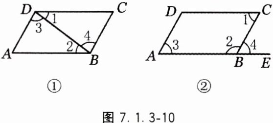 10. 如图7.1.3-10,图①和图②中的∠1和∠2分别是什么角?∠3和∠4呢?