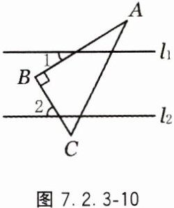 10. 如图7.2.3-10,l₁//l₂,三角板ABC如图放置,其中∠B=90°,若∠1=40°,则∠2的度数是( ).