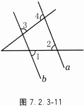 11. 如图7.2.3-11,∠1=72°,∠2=72°,∠3=70°,求∠4的度数.