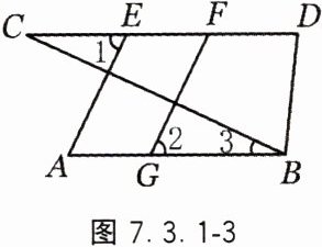 10. 如图 7.3.1 - 3,已知 AE⊥BC,FG⊥BC,∠1 = ∠2,∠D = ∠3 + 50°,∠CBD = 80°.
