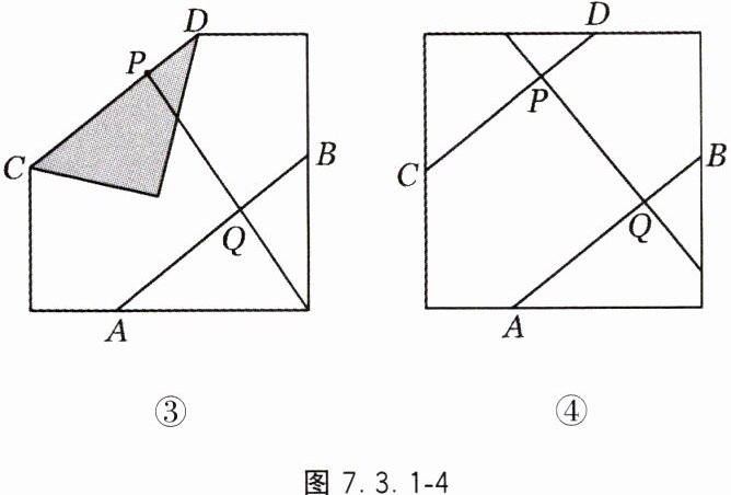 第一步:如图 7.3.1 - 4②,过点 P 进行第一次折叠,使点 B 的对称点 B′落在 AB 上,折痕 PQ 与 AB 相交于点 Q,打开纸张铺平;