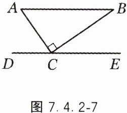 10. 如图 7.4.2 - 7,在直角三角形 $ABC$ 中,$\angle ACB = 90^{\circ}$,$DE$ 过点 $C$ 且平行于 $AB$. 若 $\angle BCE = 35^{\circ}$,则 $\angle A$ 的度数为( ).