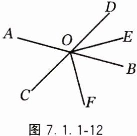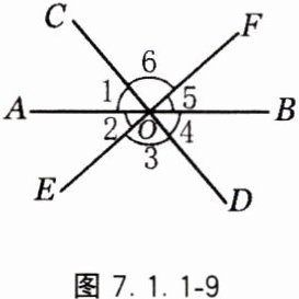 12. 如图 7.1.1-9,三条直线 $AB$,$CD$,$EF$ 相交于点 $O$,已知 $\angle1 = 50^{\circ}$,$\angle5 = 42^{\circ}$,则 $\angle2 =$________,$\angle3 =$________,$\angle4 =$_______.(填度数)