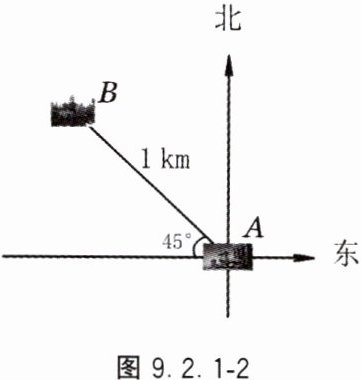 B. 北偏西 $45^{\circ}$,距离 $1$ km处