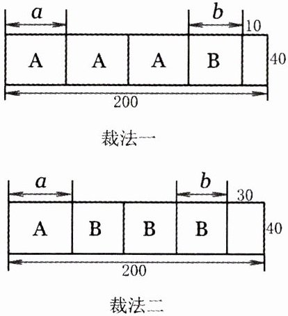 7. 某包装生产企业承接了一批礼品盒制作业务,为了确保质量,该企业进行试生产. 他们购得规格是 200 cm×40 cm 的标准板材作为原材料,每张标准板材再按照裁法一或裁法二裁下 A 型与 B 型两种板材,如图 10.3.2 - 1 所示(单位:cm).