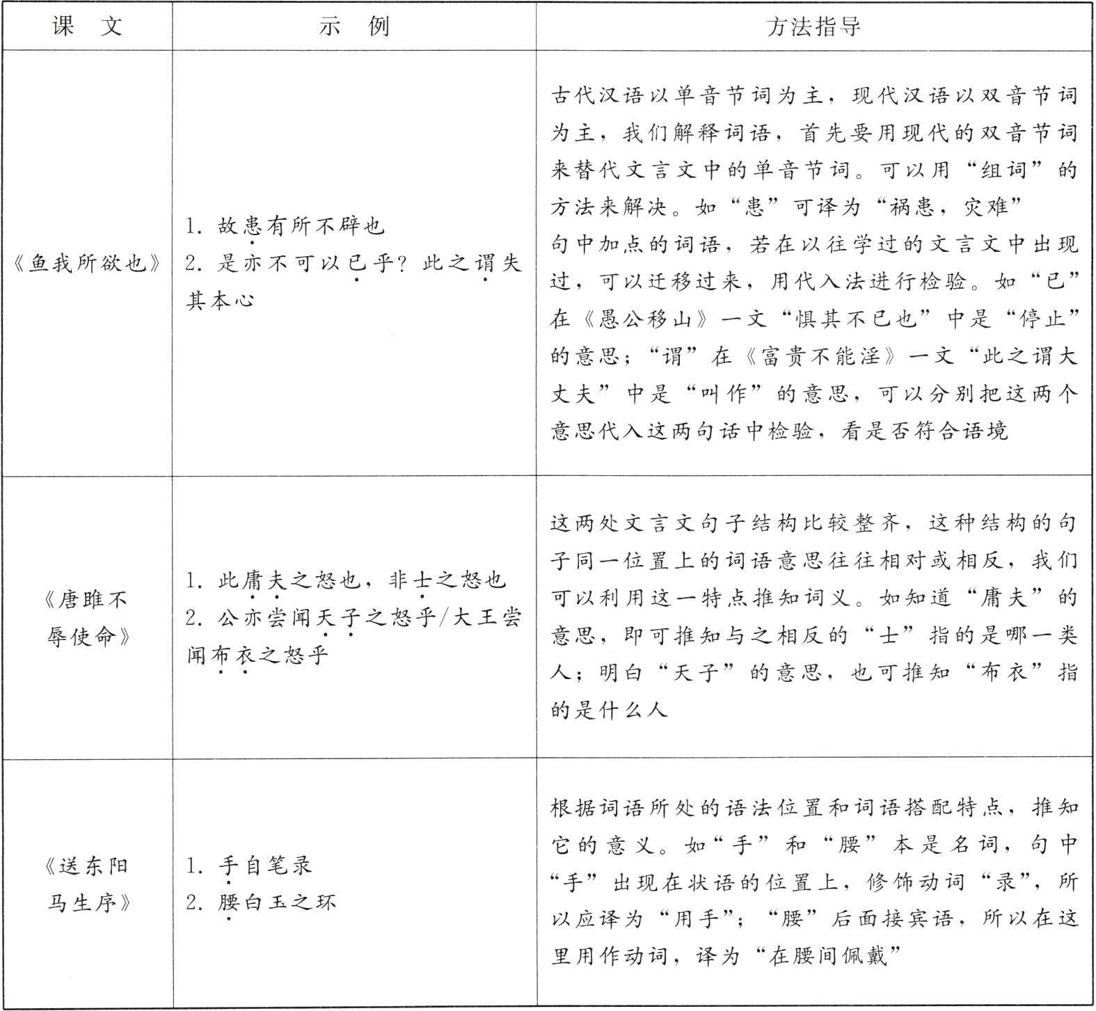 2. 是亦不可以已乎?此之谓失其本心|古代汉语以单音节词为主,现代汉语以双音节词为主,我们解释词语,首先要用现代的双音节词来替代文言文中的单音节词。可以用“组词”的方法来解决。如“患”可译为“祸患,灾难”句中加点的词语,若在以往学过的文言文中出现过,可以迁移过来,用代入法进行检验。如“已”在《愚公移山》一文“惧其不已也”中是“停止”的意思;“谓”在《富贵不能淫》一文“此之谓大丈夫”中是“叫作”的意思,可以分别把这两个意思代入这两句话中检验,看是否符合语境|