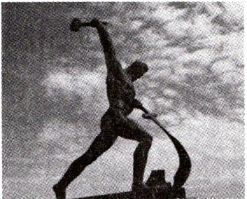 12. 下面这座雕塑名为《铸剑为犁》,请你描述其造型,揭示其寓意,欣赏雕塑的“无言之美”。(100字左右)