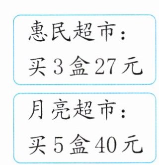 惠民超市:27÷3 = 9(元) 月亮超市:40÷5 = 8(元) 8<9 9 - 8 = 1(元) 月亮超市便宜,每盒便宜1元