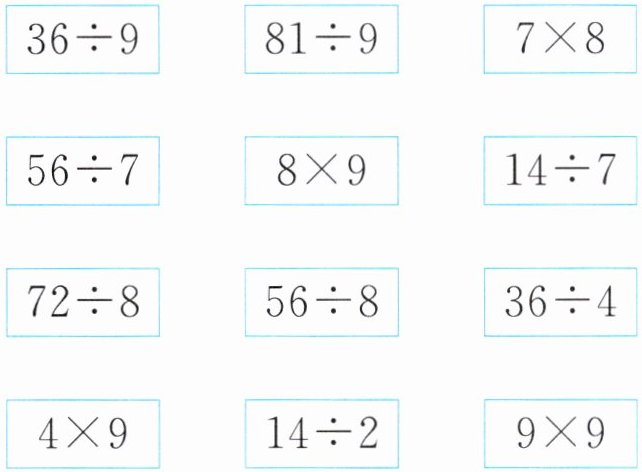 36÷9、36÷4、4×9涂相同的颜色,81÷9、9×9涂相同的颜色,7×8、56÷7、56÷8涂相同的颜色,8×9、72÷8涂相同的颜色,14÷7、14÷2涂相同的颜色