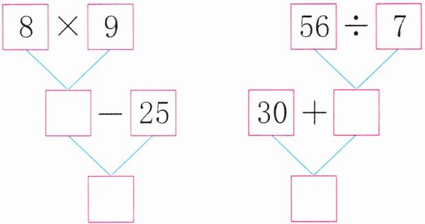 39 56 解析:第1个算式先算乘法4×9 = 36,△ + 36 = 75,△代表的就是75 - 36 = 39。第2个算式先算除法☆÷8,用倒推法,7加一个数是14,这个数是7,也就是☆÷8 = 7,☆代表的就是7×8 = 56。