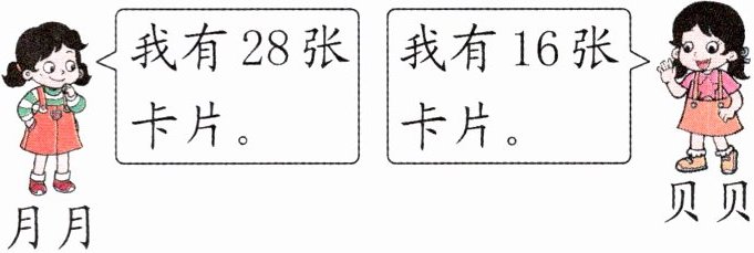 (28 - 16)÷2 = 6(张) 解析:先求出月月比贝贝多28 - 16 = 12(张)卡片,这12张卡片平均分成2份,其中1份给贝贝,她们的卡片就一样多,1份是12÷2 = 6(张)。