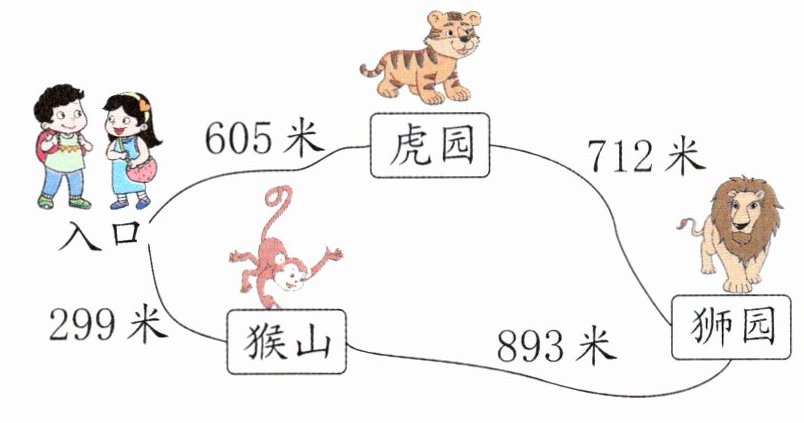 300 + 900 = 1200(米) 1200 < 1300 1300 - 1200 = 100(米) 从入口经过猴山到狮园更近,大约近100米