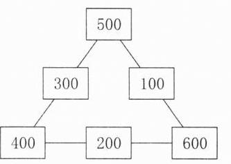 答案不唯一,如 500 300 100 400 200 600 解析:可以先在三个顶点处填上不同的整百数,再根据每条边上的三个数的和都是1200算出中间的数,注意整百数不重复。