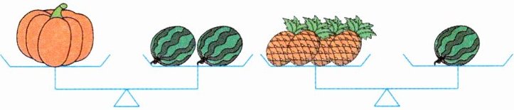 - **思路提示**:根据南瓜与西瓜、西瓜与菠萝、菠萝与梨的等量关系,通过等量代换解决问题。