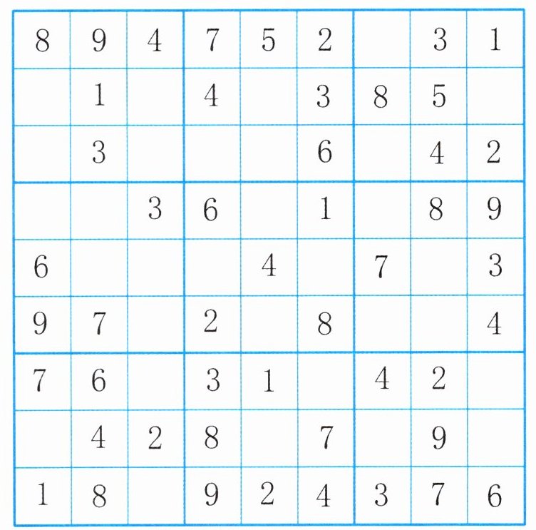 解析:看哪一个空格子所在的行、列、3×3的格子内出现了七个或八个不同的数字,从而确定这个空格里应填的数字。利用相同的方法求出其他空格里应填的数字。