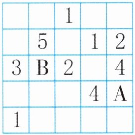 3.(杭州真题)在如图所示的方格中,每行、每列都有 1~5 这五个数字,并且每个数字在每行、每列都只出现一次,则 A 是( ),B 是( )。
