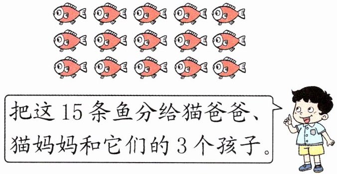 把这 15 条鱼分给猫爸爸、猫妈妈和它们的 3 个孩子。