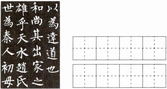 (1)请仔细观察下面的字帖,从中挑出八个不同的汉字,用楷书将它们写在“田”字格里。