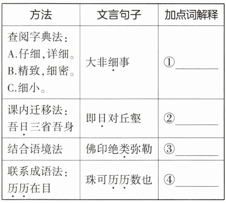 (1)(★☆☆)[新考法·学习方法]请参考下表中提供的方法,解释句中的加点词。(4分)(Y8203001)