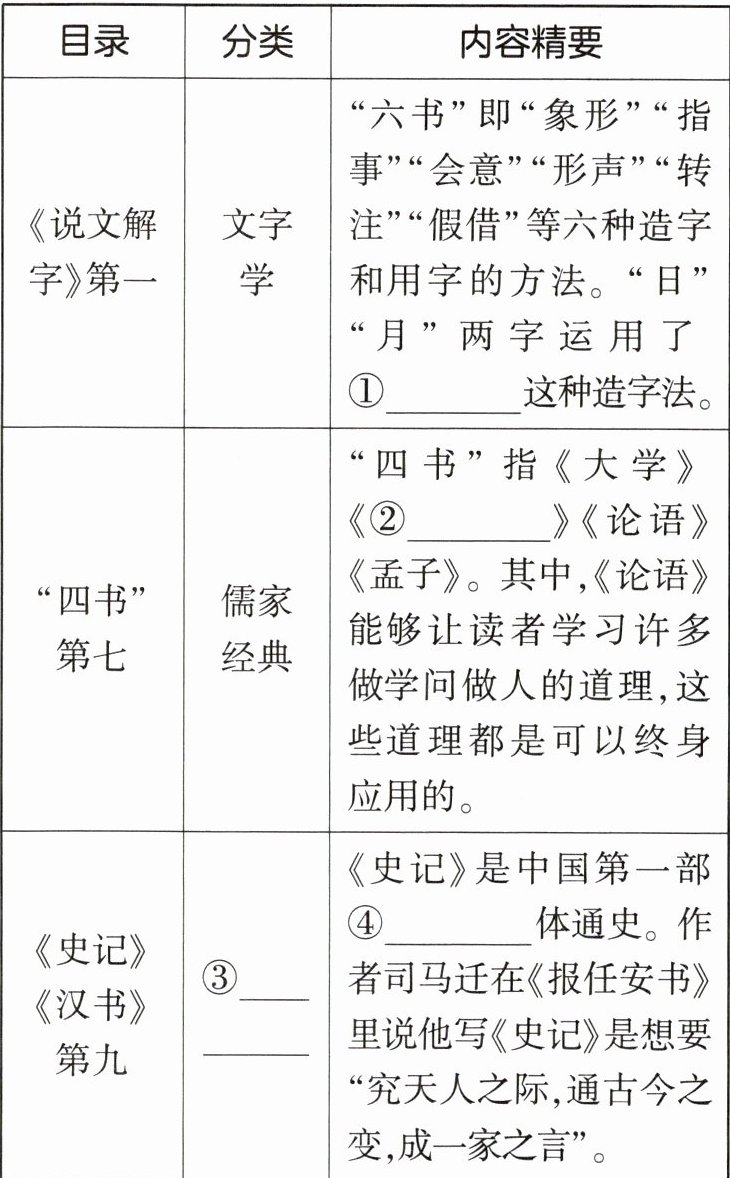 答案(1)①象形 ②中庸 ③历史典籍 ④纪传(2)(示例)朱自清的《经典常谈》囊括13篇文章,介绍了《说文解字》《周易》《史记》等经典著作,并概述了诸子百家、辞赋和历代诗文的情况,直观地展示了中国古代思想文化的基本面貌,让大家对传统文史典籍有一个比较系统的认识和了解。该书不夸奇炫博,不故作高深,也不平铺直叙,流利畅达,读起来明快利落,不蔓不枝,非常值得一读。在此,我把这本书推荐给大家,相信大家读完之后一定会大有收获。解析(1)①象形字来自图画文字,它是一种最原始的造字方法。它的局限性很大,因为有些实体事物和抽象事物是画不出来的。题干中“日”“月”的字形就像太阳、月亮的样子,所以属于象形造字法。②“四书”即《大学》《中庸》《论语》《孟子》,为历代儒家学子首要研习之书。③《史记》《汉书》是中国古代著名的历史著作,记录了中国历史上的重要事件和人物,是研究中国历史和文化的重要资料。故此空填“历史典籍”。④《史记》是中国历史上第一部纪传体通史。(2)①作者信息:朱自清先生原名自华,后改名自清,字佩弦,是我国现代文学史上著名的诗人、散文家、学者。②作品内容:《经典常谈》是朱自清编撰的国学研究专著,该书是学术性的普及读物,全书一共13篇,介绍了《说文解字》《周易》《史记》等经典著作,并概述了诸子百家、辞赋和历代诗文的情况,每一篇都是专题研究的成果。它按照传统的经史子集的顺序,把中国古代重要文献典籍的基本知识,用简练明晓的文字加以介绍,真正做到了深入浅出。③作品风格:不“板着脸说话”,也不平铺直叙,而是以流利畅达的语言娓娓道来。据此概括作答即可。