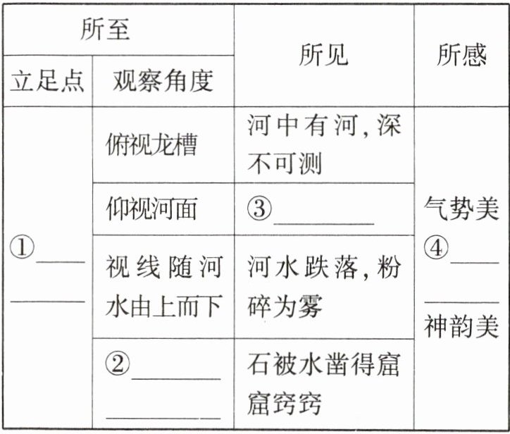 (1)①结合“我一直走到河心”得出:河心。②结合“看罢水,我再细观脚下的石……切出一道深沟”得出:俯视脚下的石。③结合“我依在一块大石头上向上游看去……排排黄浪霎时碎成堆堆白雪”得出:成“丁”字,气势宏伟。④结合“当然这么窄的壶口一时容不下这么多的水……那种猛烈”“整个龙槽就是这样被水齐地切下去”可知,作者还感受到了力量美。