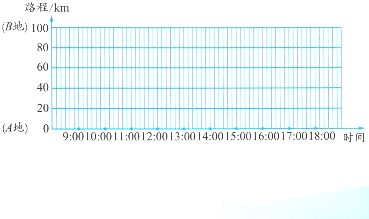 2. 早晨9:30,明明一家从A地驾车开往B地,中途不停靠,11:10到达B地。在B地吃饭、游览后,于15:30开始返回,16:10到距A地40千米的一个加油站加油,停了20分钟,17:00回到A地。请在下面的运行图上用彩色笔画出明明一家的行程。