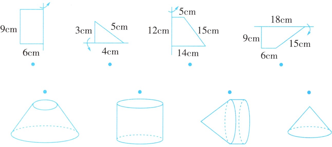 3. 下列平面图形分别围绕所示的轴旋转,将得到怎样的立体图形?用线连一连。如果这个图形是圆柱或圆锥,请指出它的底面半径和高分别是多少。