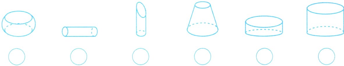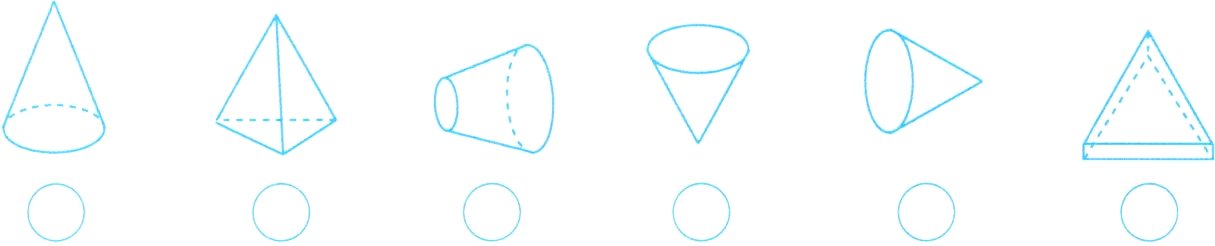 2. 下列图形中哪些是圆锥?在圆锥下面的 〇 里打“√”,并指出该圆锥的底面、侧面和高。