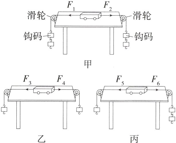 (1)甲中小车静止,受力平衡,F₁、F₂的方向相反,大小相等;左右两端同时取下一个钩码时,小车仍静止,F₃、F₄的方向相反,大小相等;当右端再挂一个钩码时,小车做变速运动,受力不平衡,此时F₅<F₆。